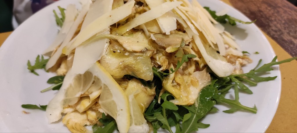 Antipasti: il carpaccio di carciofi è molto fresco, abbondante, gustosissimo perfino per lo scrivente che non lo ha ordinato non avendo il carciofo tra le sue passioni principali, ma lo ha assaggiato e potrebbe essere colui che la prossima volta lo ordinerà. L’ hummus con verdure crude e bruschetta è un’altra di quelle cose che stanno benissimo con la stagione. Prezzi giustissimi già in assoluto, di più se consideriamo la posizione.