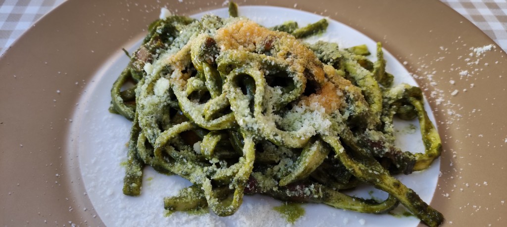 Gli antipasti combinati proposti in carta sono abbondanti e particolarmente appetitosi; su richiesta viene anche indicato cosa sia locale e cosa no; in generale si avverte che c’è consapevolezza circa la qualità che si intende offrire, e in questo senso il panorama sulle carni è di ampiezza simile a quello della valle sulla suddetta piazza. Da parte nostra la faccenda si è molto positivamente dichiarata appagnate con uno degli antipasti della casa, un’opulenta fettuccina con broccoli e guanciale, una quaglia lardellata e una cicoria, ma davvero l’antipasto è una sequenza notevole di bontà.